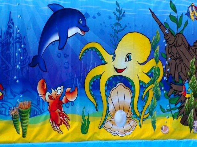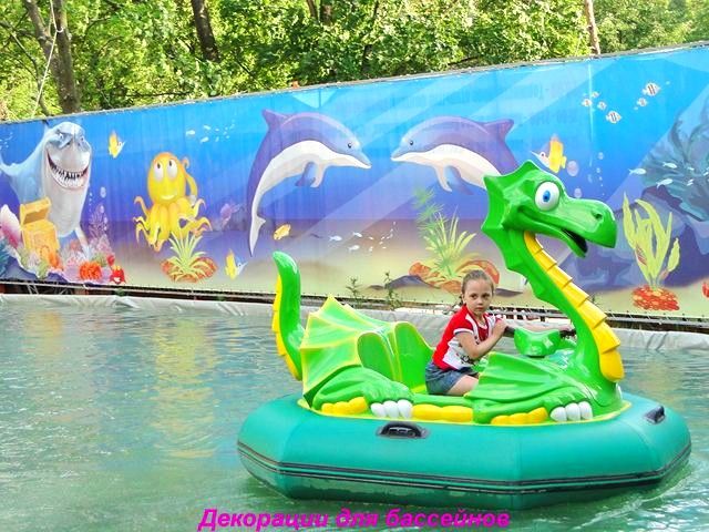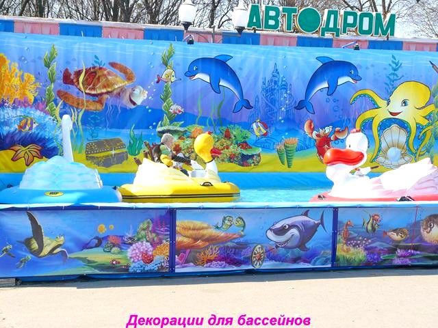 декорация "Подводный мир" Для украшения Вашего бассейна и привлечения внимания посетителей, мы предлагаем декорации "Подводный мир" - яркие цветные картинки на морскую тему, которые крепятся к бассейну внизу. Для максимального эффекта декорация может быть изготовлена в виде огромного банера над бассейном и оснащена дополнительной подсветкой для эксплуатации бассейна в ночное время.