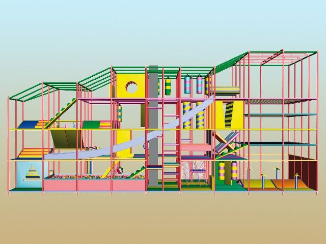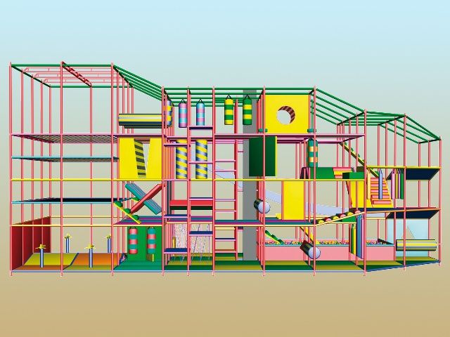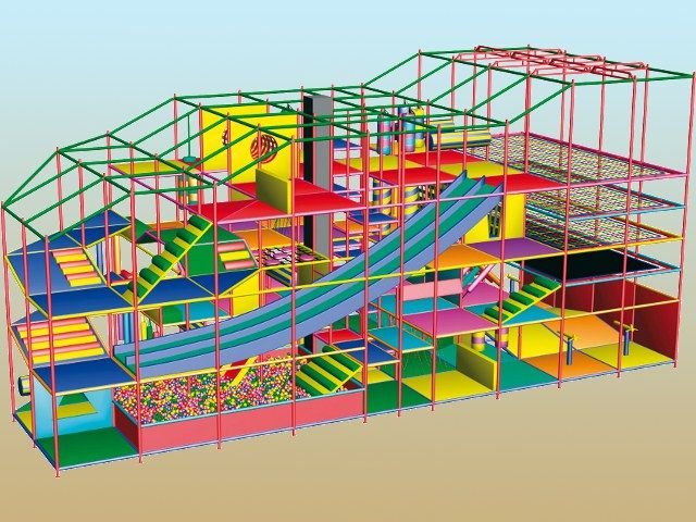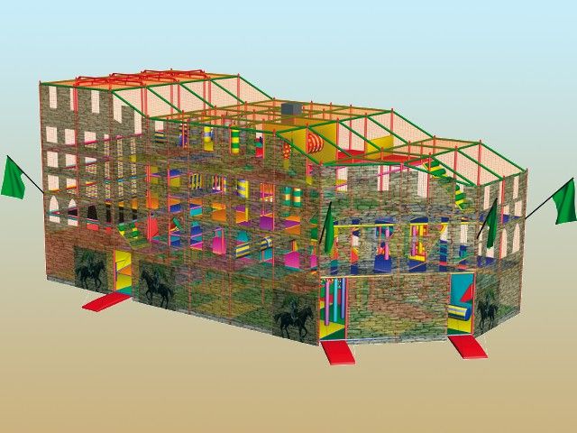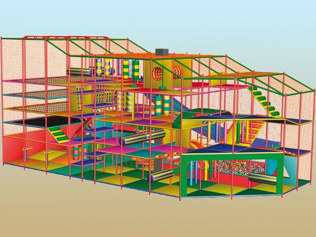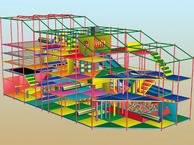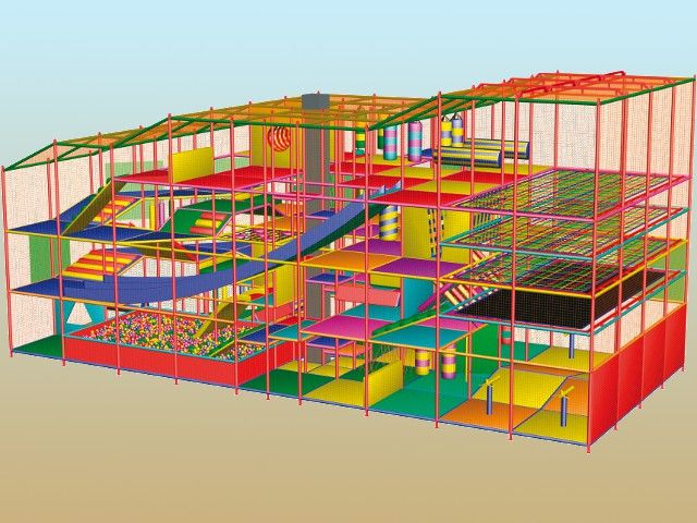 Особенность этого проекта три уровня при небольшой высоте (2,8м). Жесткий каркас в мягкой оболочке, стены из высокопрочной капроновой сетки, мягкие игровые элементы - основные составляющие этих игровых комплексов.