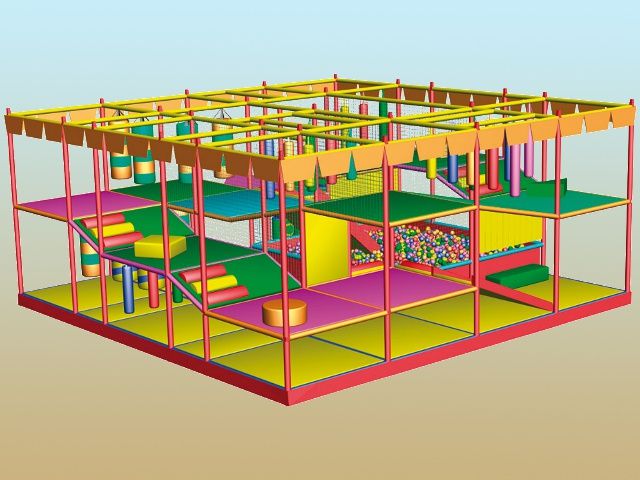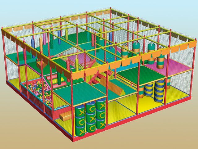 Особенность этого проекта три уровня при небольшой высоте (2,8м). Жесткий каркас в мягкой оболочке, стены из высокопрочной капроновой сетки, мягкие игровые элементы - основные составляющие этих игровых комплексов.