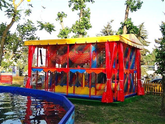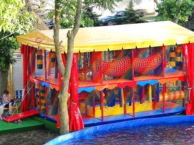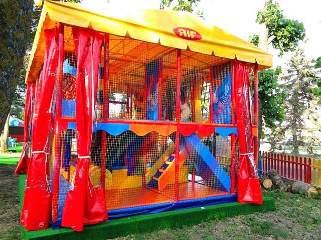 Крыша и боковые шторы - комплектация для установки комнаты вне помещений. Для приведения этого комплекса в рабочее состояние необходимо несколько минут подготовки. Тысячи разноцветных шариков в бассейне позволяют абсолютно безопасно "плавать" в них детям разного возраста.