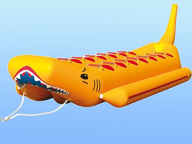 Водный аттракцион “Акула” - может быть с сдвоенным корпусом как у классического “Банана”, по свойствам абсолютно ничем не отличатся от него, только дизайном. Особенно он хорош тем, что на нем совершенно спокойно могут кататься дети и те, кто просто боится, либо не хочет оказаться в воде. Его сдвоенная конструкция обеспечивает безопасность при катании, и даже при достаточно резких поворотах катера, переворачивание аттракцион “Акула - Twin” невозможно.