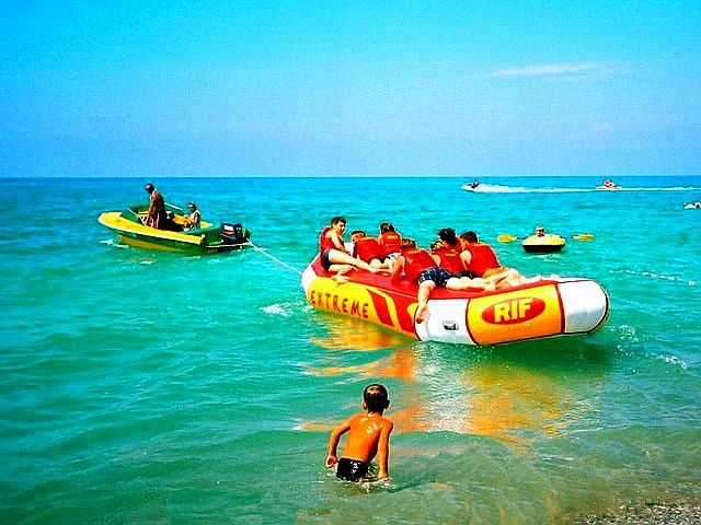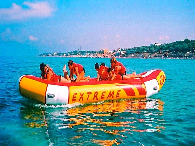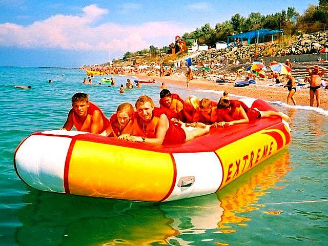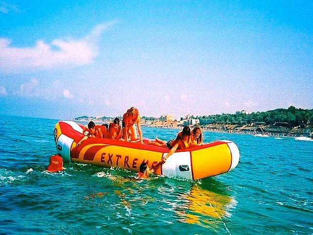 Кататься лежа также можно и на аттракционе Экстрим. На нем может одновременно находиться от 4 до 8 человек в зависимости от модели - чем меньше людей, тем больше развивается скорость. Самое главное - это держаться как можно крепче за специальные удобные ручки, иначе при первом же крутом вираже вы окажетесь в воде! Вперед за приключениями с новым буксируемым водным аттракционом Экстрим!