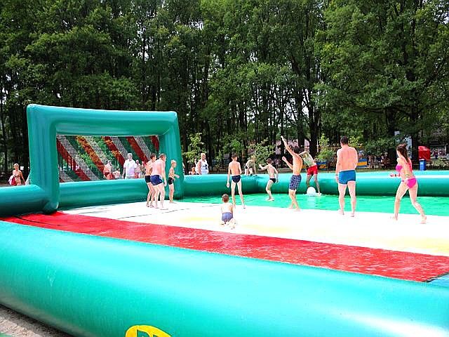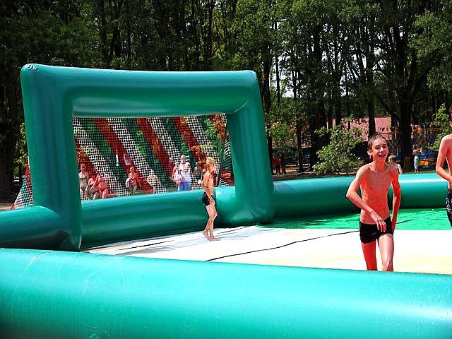 Состоит он из надувного поля, ворот и вентилятора, который наполняет аттракцион воздухом. На поверхность поля необходимо налить тонкий слой воды так, чтобы возможно было бегать по нему, и вперед забивать голы! Мокрая поверхность игрового поля усложняет игру, игроки часто падают на мягкое поле, а чтобы добежать до ворот и к тому же еще забить гол - это точно удастся не каждому! Захватывающее зрелище и прекрасная игра!